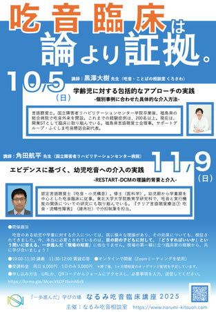 今回は、黒澤大樹先生(吃音・ことばの相談室 くろさわ)と、角田航平先生(国立障害者リハビリテーションセンター病院)をお招きし、学童期と幼児期の臨床について語っていただくこととなりました。